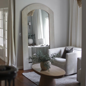 Elevate your space with this simple, yet sophisticated floor mirror. The gently rounded arch of our Iris leaning floor mirror effortlessly adds a grand accent to your entryway, living room or bedroom.