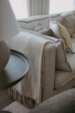 Add warmth and style to your living space with this ivory acrylic throw featuring subtle striped patterns and elegant fringed edges. Crafted from soft, lightweight acrylic, it provides cozy comfort while being easy to maintain and resistant to wear. The neutral ecru color blends seamlessly with a variety of interior designs, making it a versatile accessory for your sofa, bed, or favorite chair. Perfect for layering during chilly evenings or adding a decorative touch, this throw combines practicality with sophisticated texture to enhance any room’s ambiance.
