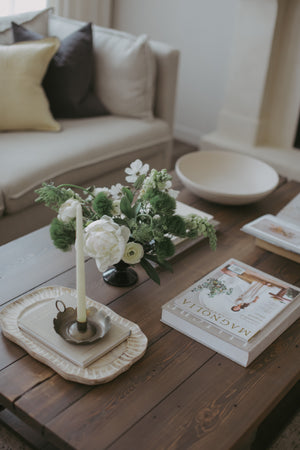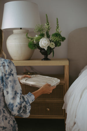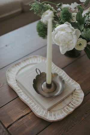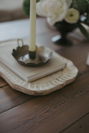 This exquisitely carved mango wood tray features a whitewash finish, making it an ideal accent for coffee table arrangements. Its detailed craftsmanship brings a unique charm and depth, perfect for enhancing layered decor.