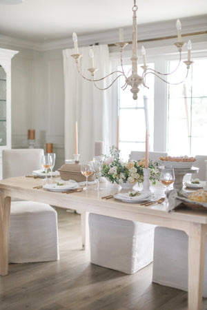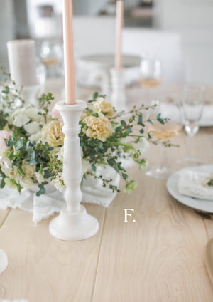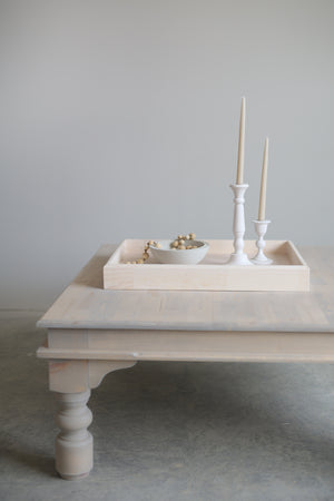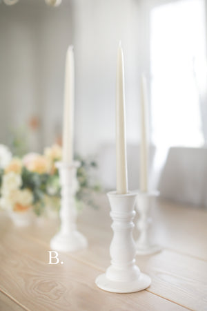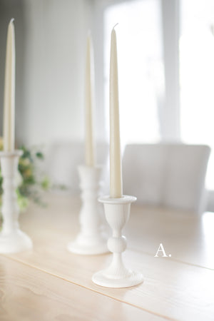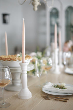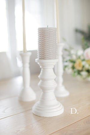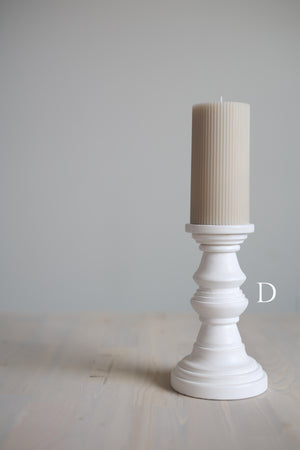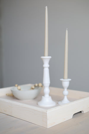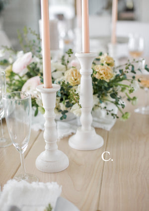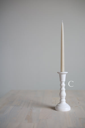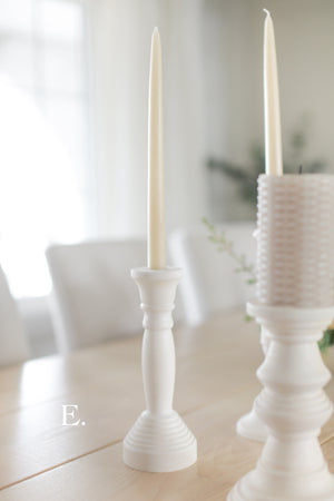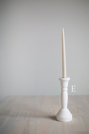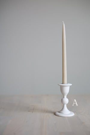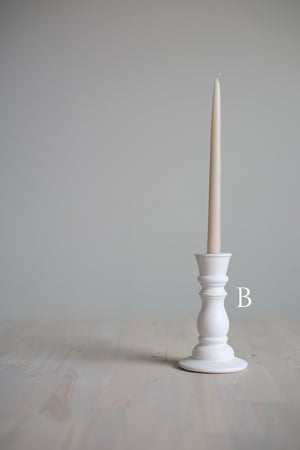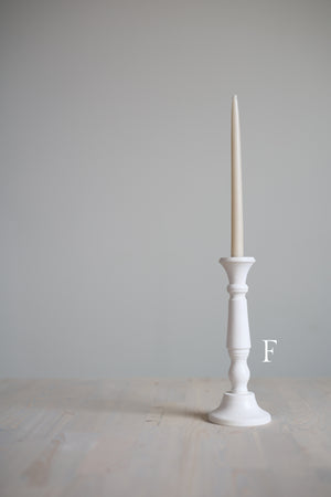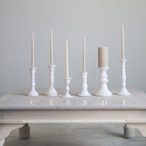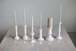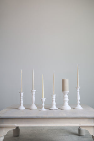 These beautiful hand-turned wood candle holders are all unique in design and varied in size. Available to purchase as a set of 6 (one of each) or ordered individually. Candles sold separately. Shown in white painted finish, no longer available.
