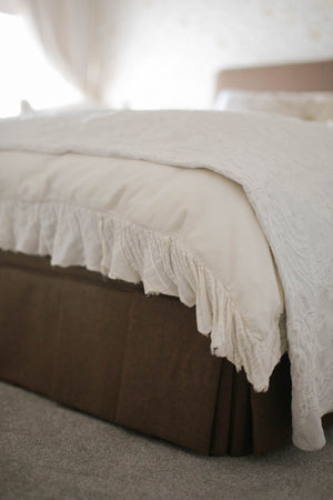 Experience the elegance and sophistication of the Marlowe Bedframe, boasting a pleated skirting and an extra deep headboard available in both cream and brown tones. A must-have addition to any bedroom.