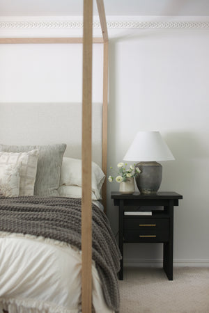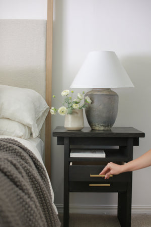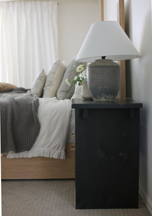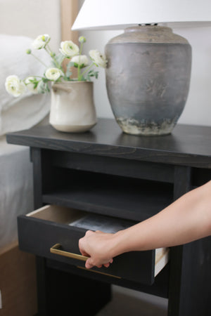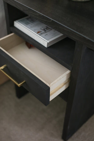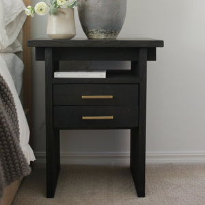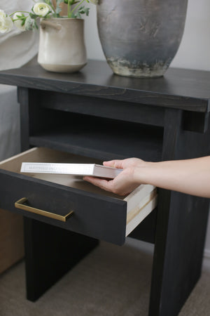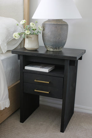 The slim lines and the construction of the Burke Nightstand feel light and fresh; while at the same time the interlocking bridle joints give the feeling of nostalgia. Designed with a slim shelf and two drawers, perfect to keep things tucked away, yet conveniently accessible. Could also be used as an accent table in any living space.