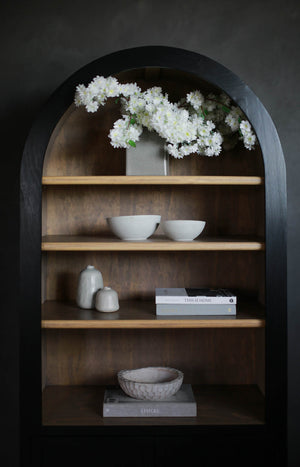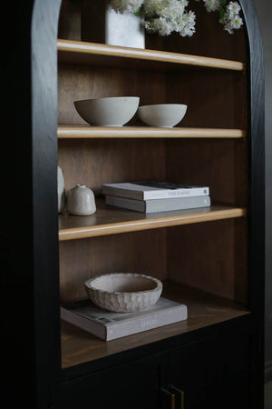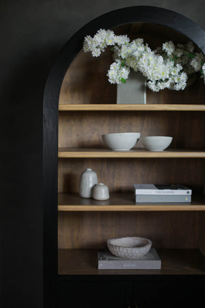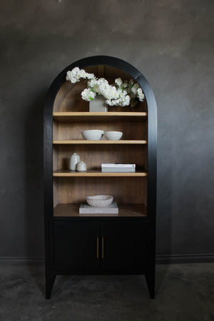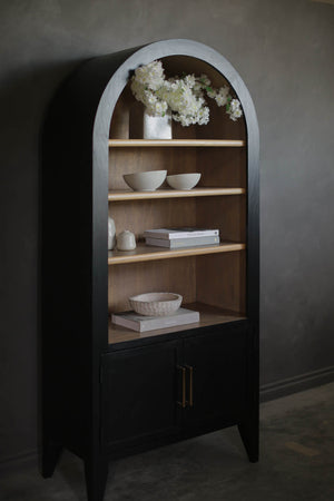 Introducing the perfect blend of elegance and functionality – our stunning arched cabinet! With its sleek black exterior, this cabinet brings a touch of sophistication to any room with a warm honey-stained interior that radiates coziness and charm.