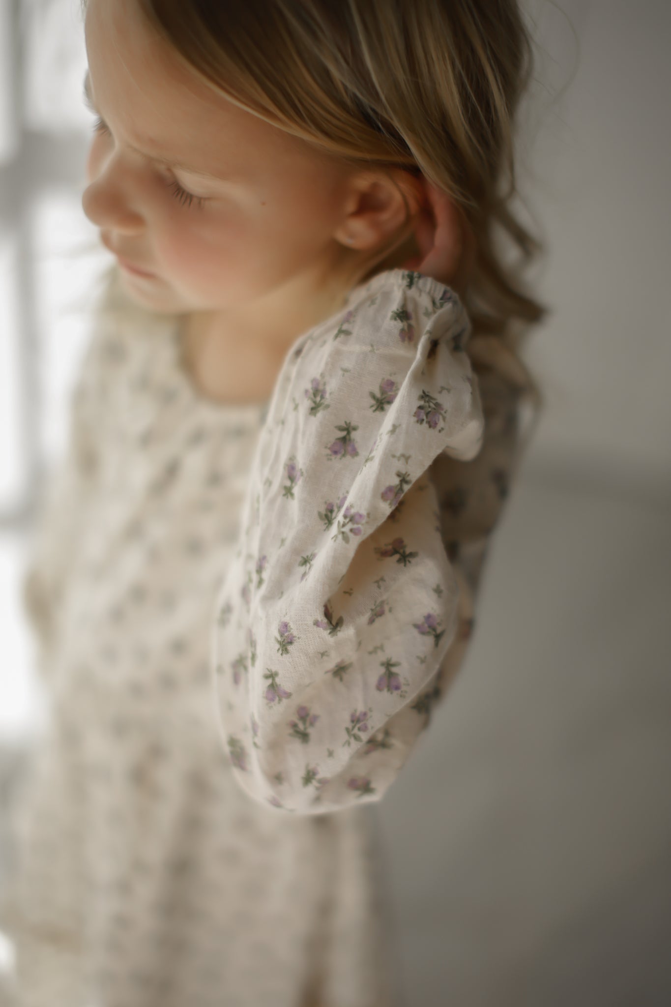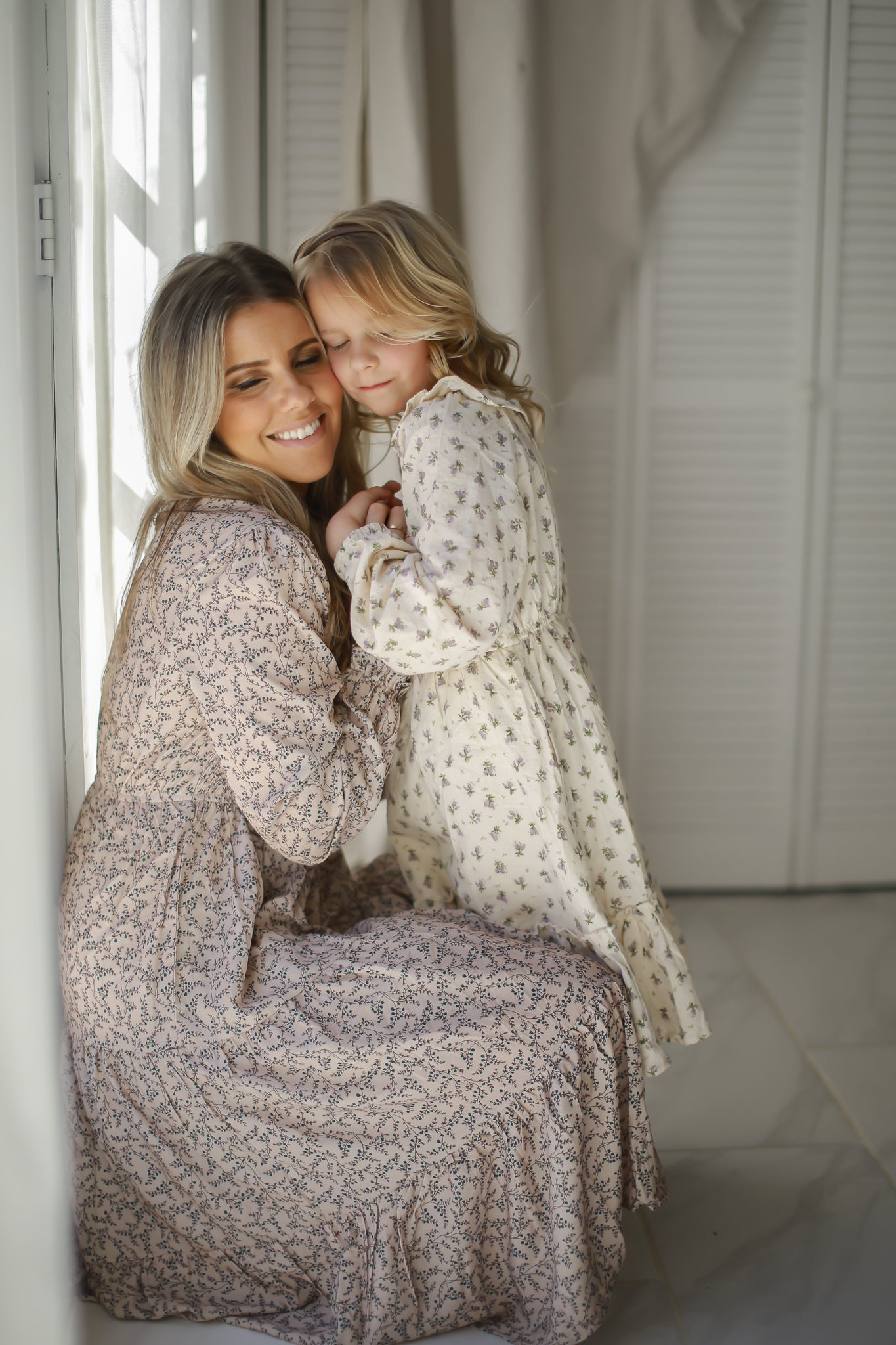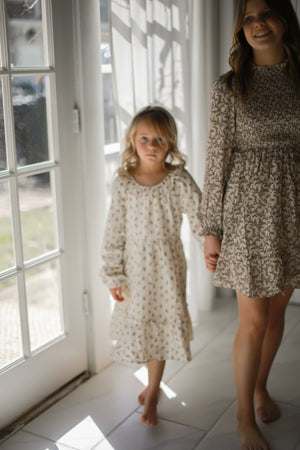 This beautiful textured floral print, ruffle, bibbed dress features: