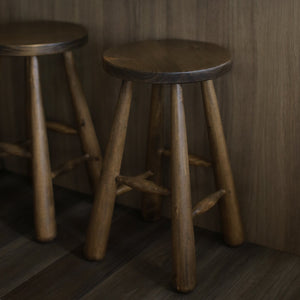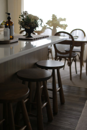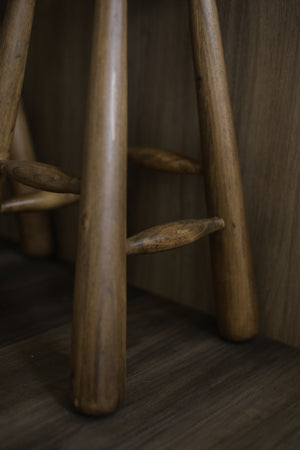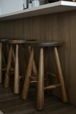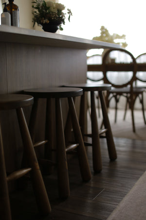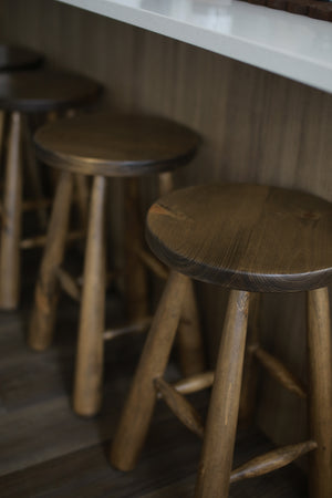 The Flynn Bar Stool features a distinctive design with elegantly tapered rounded legs, adding a touch of unique character. Each piece is handcrafted, making it one-of-a-kind. This stool effortlessly combines style and comfort with its smooth pine construction.
