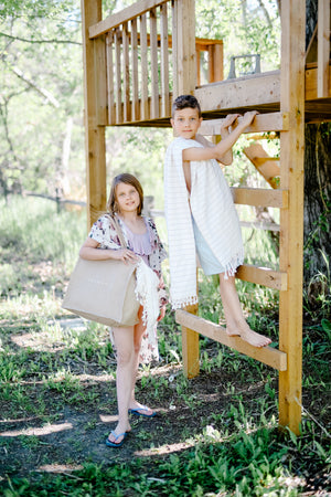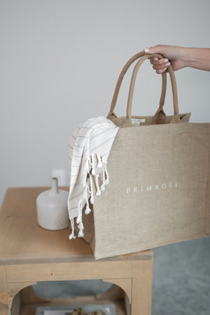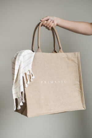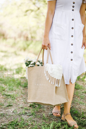 Our water-resistant jute totes are versatile and stylish, branded with our logo. This reusable bag makes it easy to tote your market finds, pack gifts, or fill it with all your beach towels. Sturdy and cute!