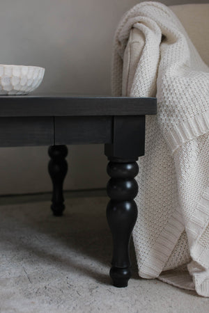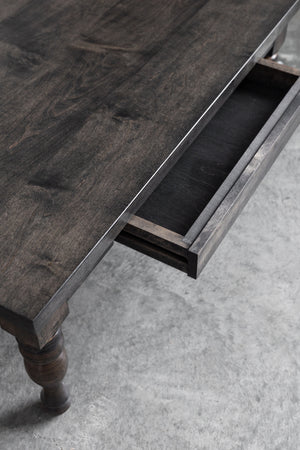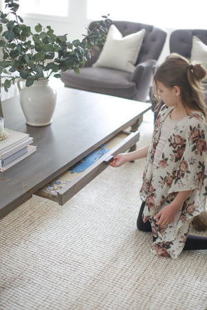 The Hazel Coffee table has a hidden drawer that can be pulled out completely and can be used for Puzzles or other activities. The legs are hand-turned and have a slim design that is both beautiful and timeless.