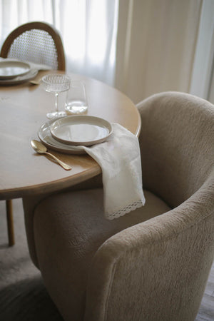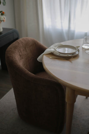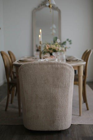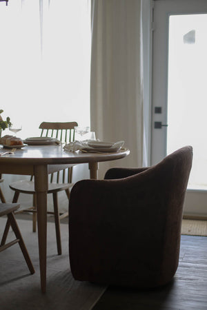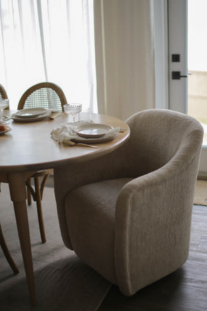 Crafted with a focus on comfort, the Marlowe dining chair puts a modern spin on the timeless barrel chair design. Featuring a seamless curve from arms to back and a padded square seat wrapped in soft, textured fabric, this chair offers unparalleled comfort and versatility. Simply replace the rolling base with included plastic legs to transform it into stationary seating.