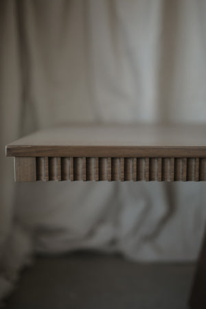 This handcrafted rectangular dining table is a timeless statement piece, thoughtfully designed to bring warmth and character to your space. Featuring a beautifully detailed fluted skirting, it adds subtle texture and refined elegance to the clean rectangular silhouette.