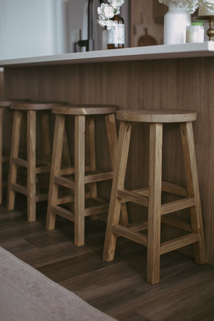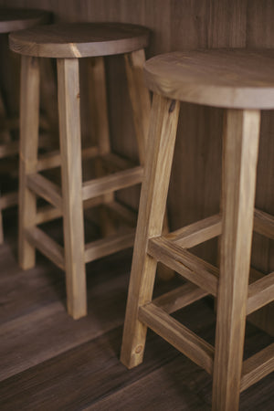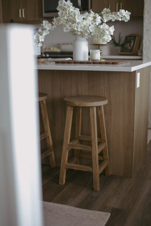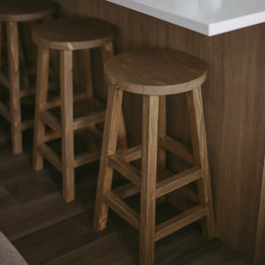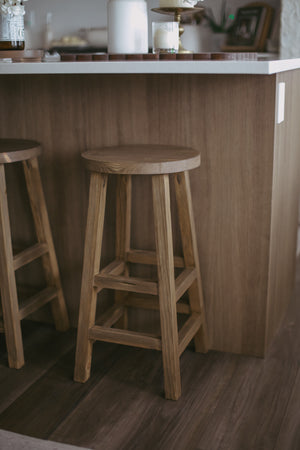 The Okla Bar Stool is crafted with raw - elegance finish on pine wood for a rustic and unique addition to your home. Each stool is custom-made and one-of-a-kind, adding natural warmth and character to any space.