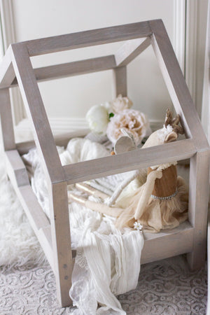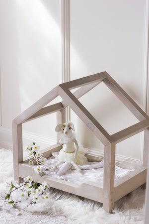 This charming doll bed is the perfect landing place for a favorite doll or stuffy. The sweet sloped canopy will inspire hours of imaginative play. This piece would also make an adorable small pet bed.
