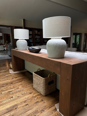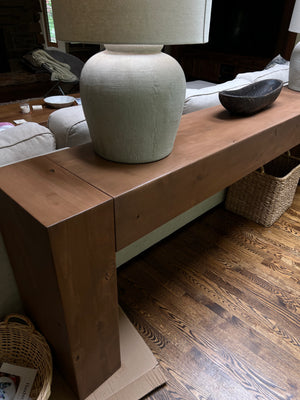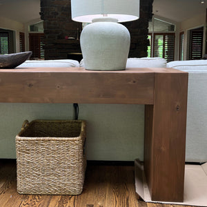 The James Console is a sturdy and stylish statement piece that will last for years. Crafted from solid pine, this thick, chunky console is sure to give your home an elegant and classic look. Choose your favorite stain to customize it to your space.