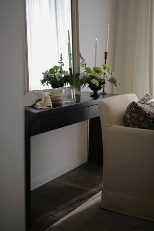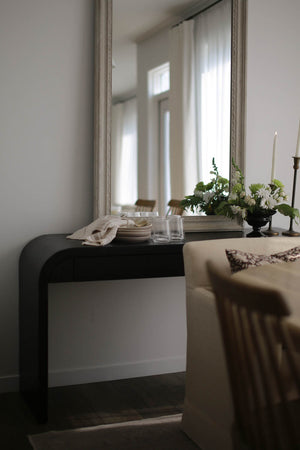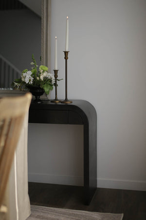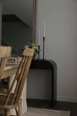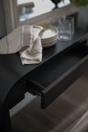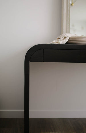 The Weston Console is a stunning and enduring addition to any room, bringing a touch of sophistication and grace. Handcrafted from solid wood, its unique waterfall design and curved edges create a welcoming atmosphere while maintaining a sleek and modern aesthetic. Perfect for mid-century enthusiasts, this piece seamlessly blends contemporary style with timeless elegance and includes 2 drawers. Elevate your decor with the Weston Console.